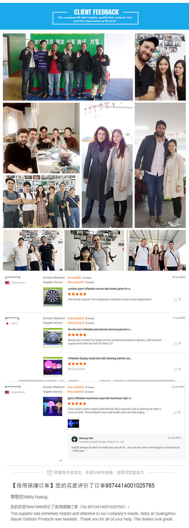 We have a variety design of advertising inflatables, outdoor movie screen , planetarium dome, led inflatables…… We also have a professional team to design and produce inflatables entertainment product for both kids and adults. .We provide products for different event, advertising, commercial, rental, decoration, wedding , opening celebration and exhibition